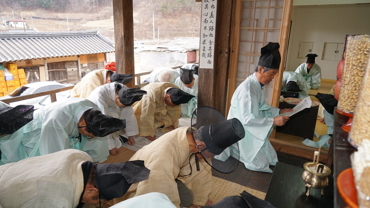 고인의 이름과 생전의 덕을 기리는 제문을 읽으며 추모의 뜻을 전합니다. - 헌작 세 번