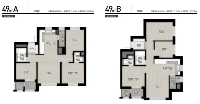 - 계약면적: 공급면적 + 기타 공용면적(지하 주차장 등)